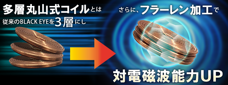 従来のBLACKE EYEに使用している丸山式コイルを3層にし、フラーレンと組み合わせることで、今まで以上の対電磁波能力を高めることに成功しました。