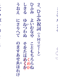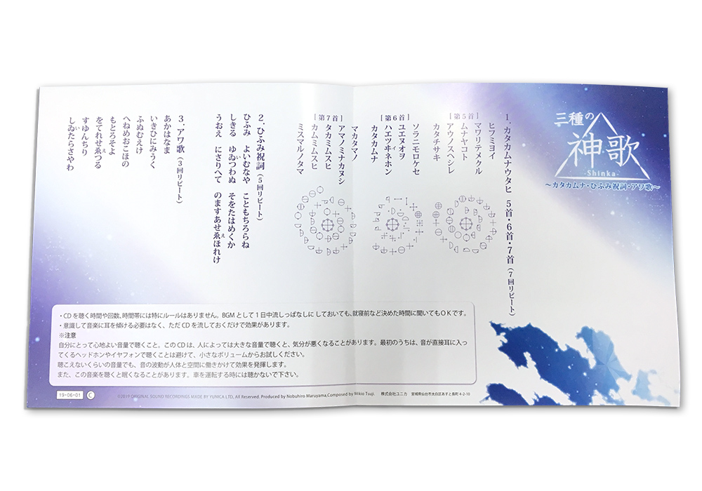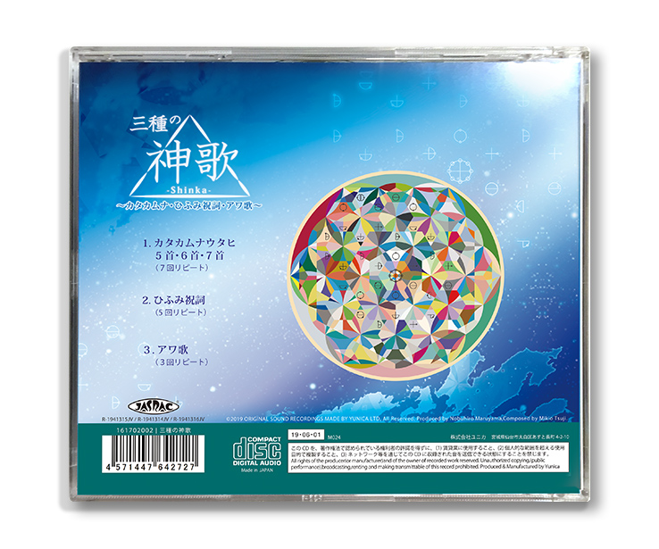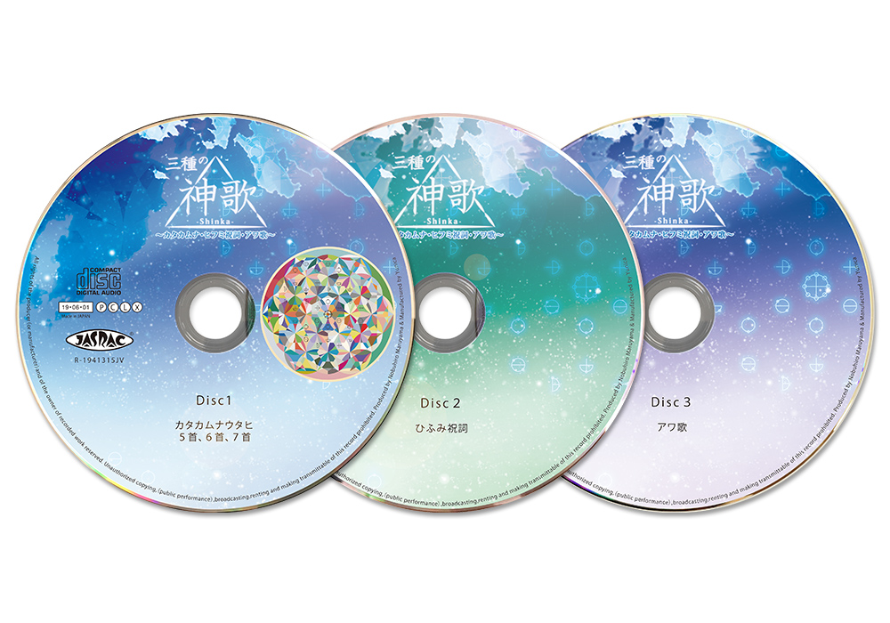 | 収録曲 | ディスク1:カタカムナ5首6首7首(7回リピート) ディスク2:ひふみ祝詞(5回リピート) ディスク3.アワ歌(3回リピート) |