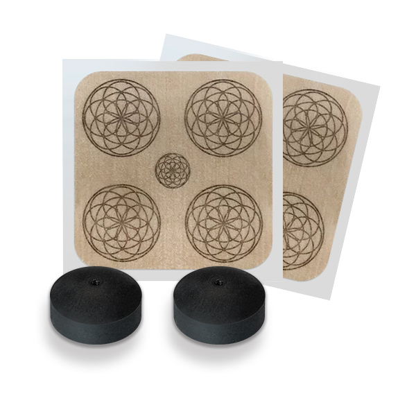| 付属の貼付シールは 『BLACK EYE Gaiusシリーズ カムナセラッミクシール(スクエア型)』です。 対電磁波作用を強めるフラーレン加工されたセラミックをシール表面にプリントした「身体用・運氣用」の貼付用シールです。 あわせて、クスリエ(※1)×ソマチット×テラヘルツ(※2)のパワー効果も期待できます。 |