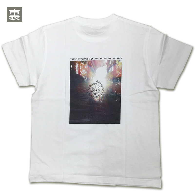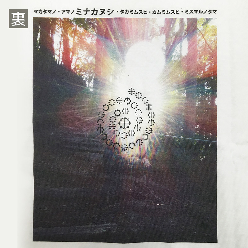 | カタカムナ | 七首 とある神社で撮影されたミスマルノタマにカタカムナウタヒ第7首を組み合わせたデザインのTシャツです。 アマノミナカヌシ、タカミムスヒ、カムミムスヒの3柱の神様の力によって、ミスマルノタマ(異空間)ができることを示します。 |