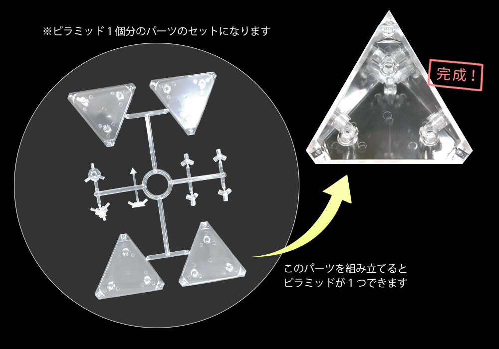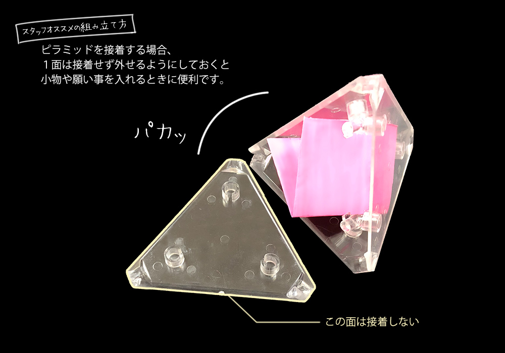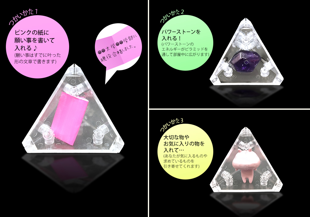 使い方は簡単!パーツを組み立て、ピラミッドの中にあなたの願い事を書いた紙やパワーストン、大切な物やお気に入りの物を入れるだけです。