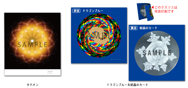 | クスリエ | 12種類 ファーストオメファの神託 / カタカムナπ / カタカムひふみ祝詞ガウス / カタカムナ第5首マンダラ / カタカムナ第6首マンダラ / カタカムナ第7首マンダラ / タチオン / ドラゴンブルー&結晶カード / カタカムナ・フトマニガウス / DNAグリーンコード / アマテラスイセ集合 / センチネル |